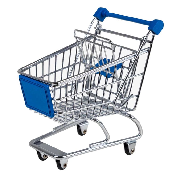 Como objeto físico: una réplica a escala de un carrito de compras, probablemente un artículo decorativo, porta-objetos de escritorio, o juguete.