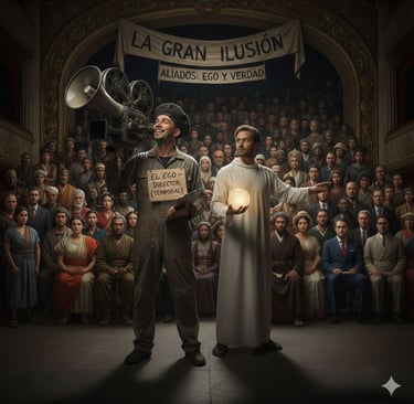 Y ahí están los dos aliados en el escenario. El Ego como director temporal, con su cámara, con su megáfono, con su cartelito de cargo que él mismo se puso. Dirigiendo la función, creyéndose indispensable, pero con fecha de vencimiento escrita en su propia credencial. Y la Verdad de blanco, con su esfera luminosa, señalando hacia afuera como diciendo "miren allá, eso es lo real", cuando el gesto mismo es parte de la función.